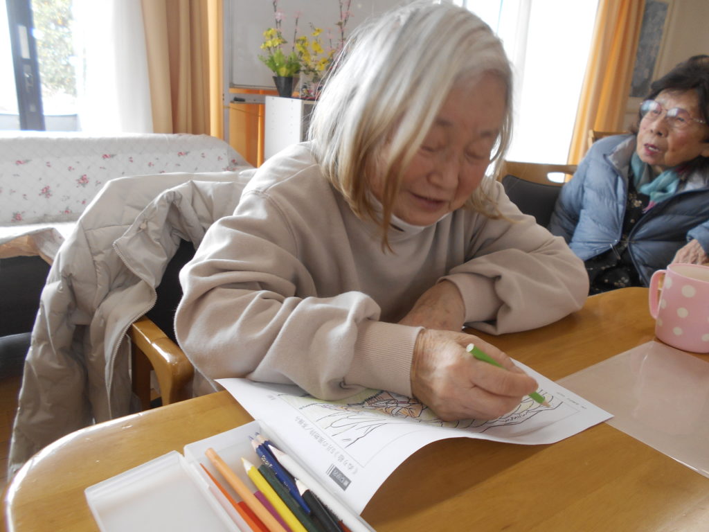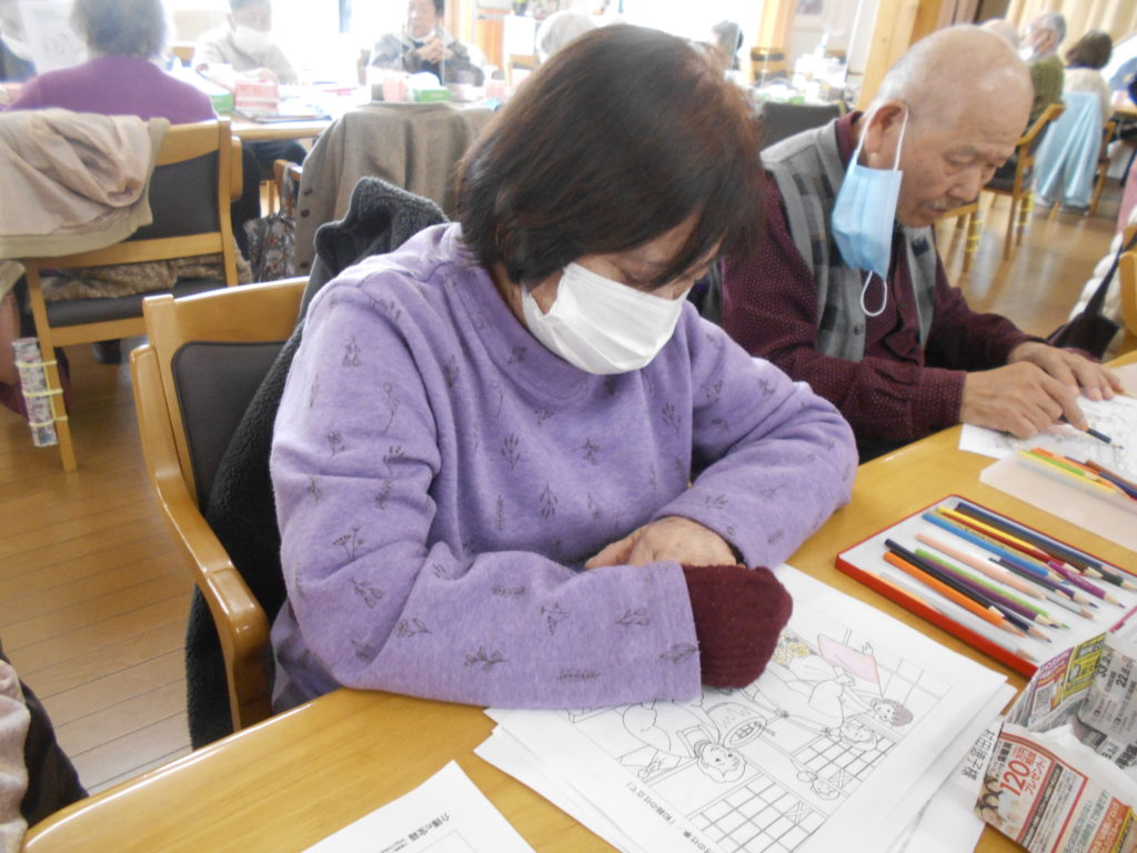 BLOG 午前中の過ごし方✨😄 2025年3月11日2025年3月11日objective 午前中は、皆さん思い思いに過ごされています。主に、塗り絵を行ったり、間違い探しのプリントに取り組まれたりしている方が多いです!始めると結構夢中になってしまうみたいです😁 特に午前中は、昔懐かしい曲がホール内に流れています!口ずさんだり、歌っている方もいらっしゃいますよ~🎤