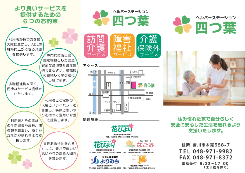 当社は、その様な高齢者や障がい者に、可能な限りご自身の力で生活を維持していただく事(QOLの維持向上)を目的として、日常的に介助や医療を必要とする状態になっても、それぞれのライフスタイルに合ったサービスを提供し、すべてのご利用者様と入居者様が「自立した生活」を「成し遂げようとする」ことができる「空間」である様に心がけております。